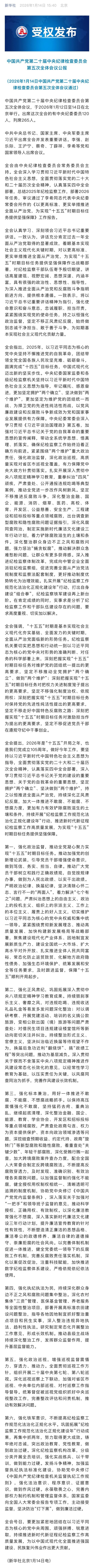 中国共产党第二十届中央纪律检查委员会第五次全体会议公报