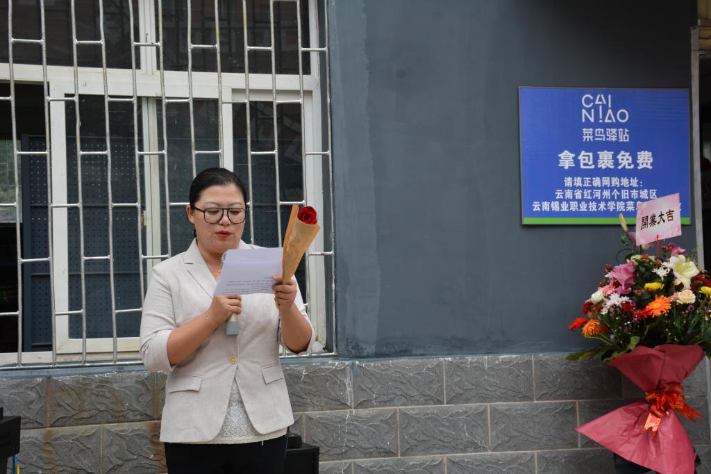 李蕾在开业典礼上致辞。李蕾代表学院全体师生向关心和支持“菜鸟驿站”筹建工作的各界朋友表示最热烈的欢迎和衷心的感谢!她强调,菜鸟驿站入驻学院,不仅保证了师生方便快捷的收寄包裹,感受线上线下一体化服务和现代电商的魅力所在,更能为物流专业的同学们更为贴切的感受互联网营销规则、现代营销推广工具及管理的各项操作流程提供了直观的实践基地。同时,还有利的规避了在校学生外出收寄快递的安全风险,更有利的激发了学生的创业热情。