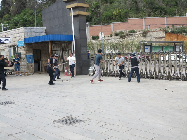 为预防和有效处置各类恶性伤害师生事件的发生,检验校园安保人员应对突发性暴力事件的反应和处置能力,按照学院的部署和安排,5月31日下午,学院在校门口举行了反恐防暴演练,个旧市公安局建设路派出所民警及学院后勤保卫部、门卫以及护校队等安保人员参加了演练。