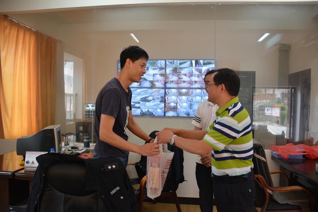 10月4日上午,学院党委副书记、常务副院长、工会主席张家涛来到保卫处,亲切看望并慰问了节日期间仍坚守在工作岗位上的保处值班工作人员,并代表学院党委、行政衷心地感谢大家为学院发展所做出的贡献,祝愿大家中秋国庆快乐、身体健康、工作顺利。张家涛巡视了校园,重点检查了学院重要安全隐患源点。他希望值班工作人员节日期间务必要加强安全防范,确保校园安全稳定。