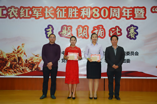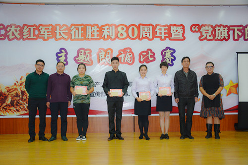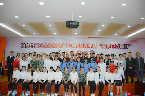 为隆重纪念中国工农红军长征胜利80周年,讴歌中国共产党为实现中华民族伟大复兴中国梦的奋斗历程和光辉业绩,充分展示职业学院广大教职员工立德树人、追求卓越、勇攀高峰的良好精神风貌。11月16日晚19:30分,由职业学院党委主办,党委宣传部、思政部、学生处和团委承办的纪念中国工农红军长征胜利80周年暨“党旗下的誓言”主题朗诵比赛在508报告厅举行。学院领导班子、助理以上管理干部、各党支部全体党员以及200多名学生观看了比赛。