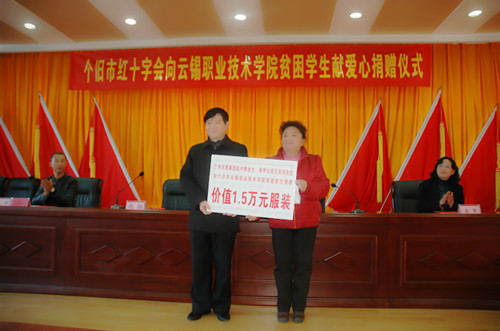 学院常务副院长李建波在捐赠仪式上代表学院讲话:一是向个旧市红十会以及社会各界爱心人士多年来一直关心、关注学院贫困学生的学习和生活以及学院的发展表示衷心的感谢;二是希望受捐贫困学生要勤奋学习,不断进取,要怀着一颗感恩的心做一个品学兼优的人,用有优异的成绩,过硬的本领回报父母和社会,让“爱”的接力棒传的更远;三是希望贫困学生要专心学习,切勿担忧各种困难,学院将一如既往的关心和关注贫困生的学习和生活,采取一系列措施为贫困生解决后顾之忧,帮助贫困学生顺利完成学业,走入社会建功立业。