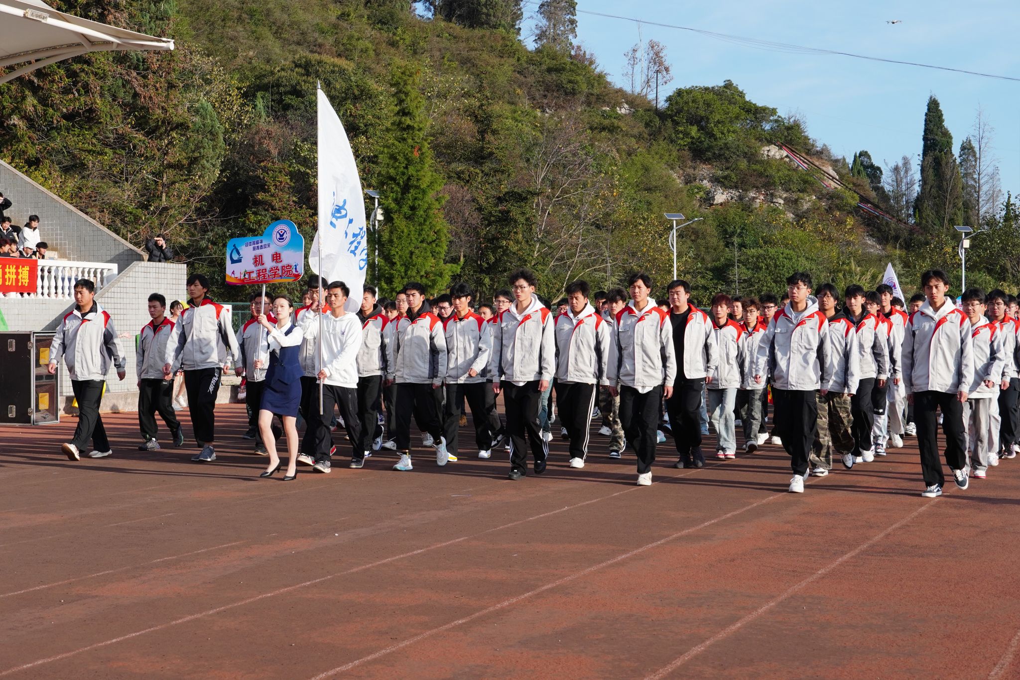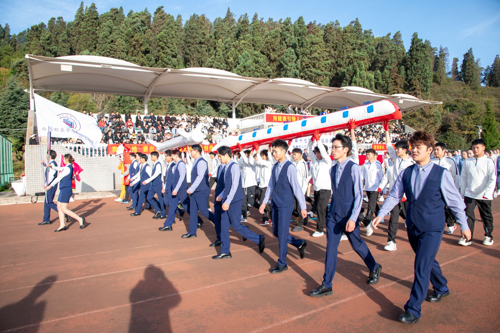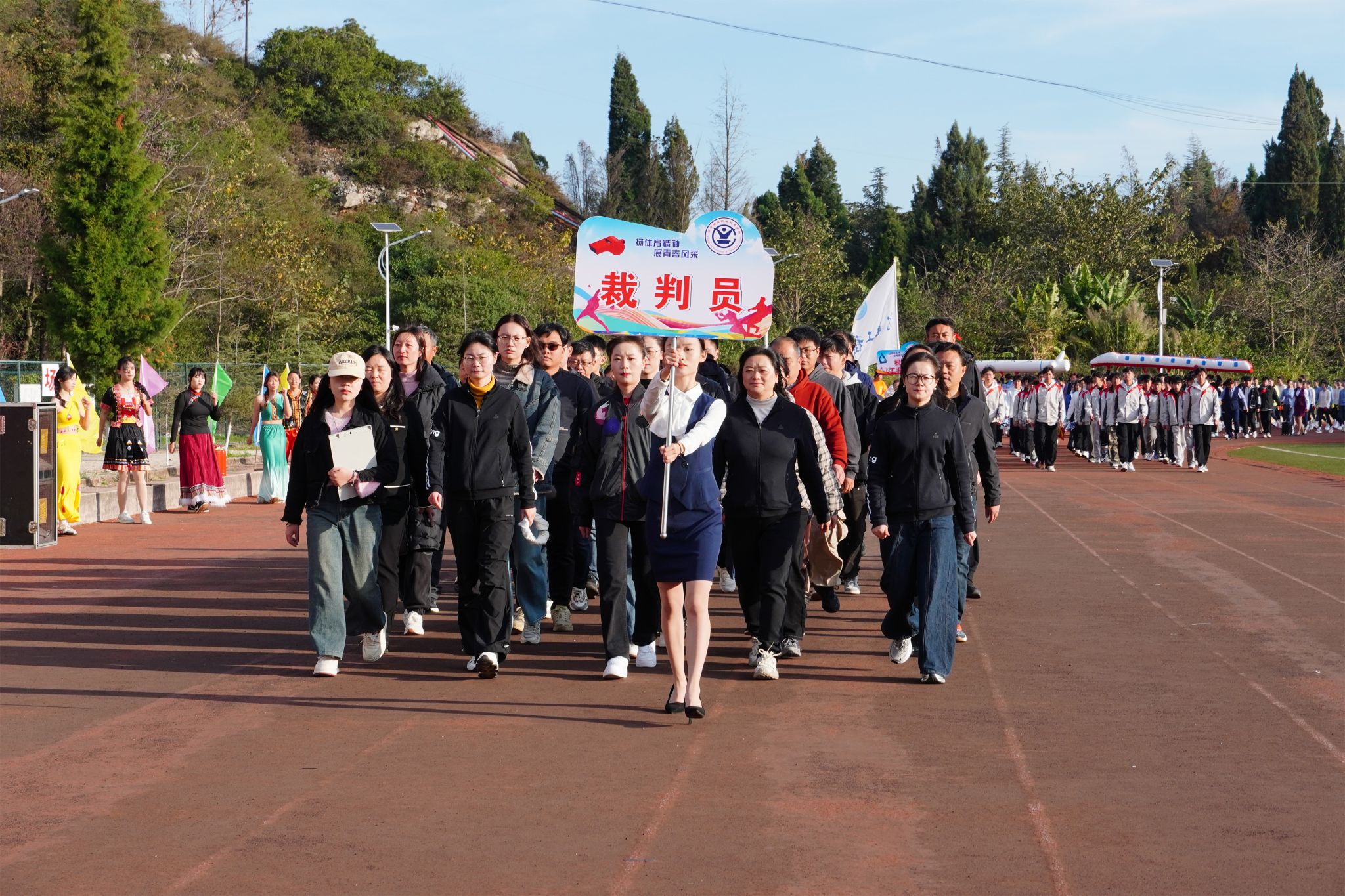 在《运动员进行曲》激昂的旋律中,国旗方队步履铿锵、英姿飒爽,随后,校旗方队、各学院代表方队及裁判员代表队依次入场,他们昂首挺胸,阔步前行,展现出昂扬的精神风貌与坚定的信念决心。