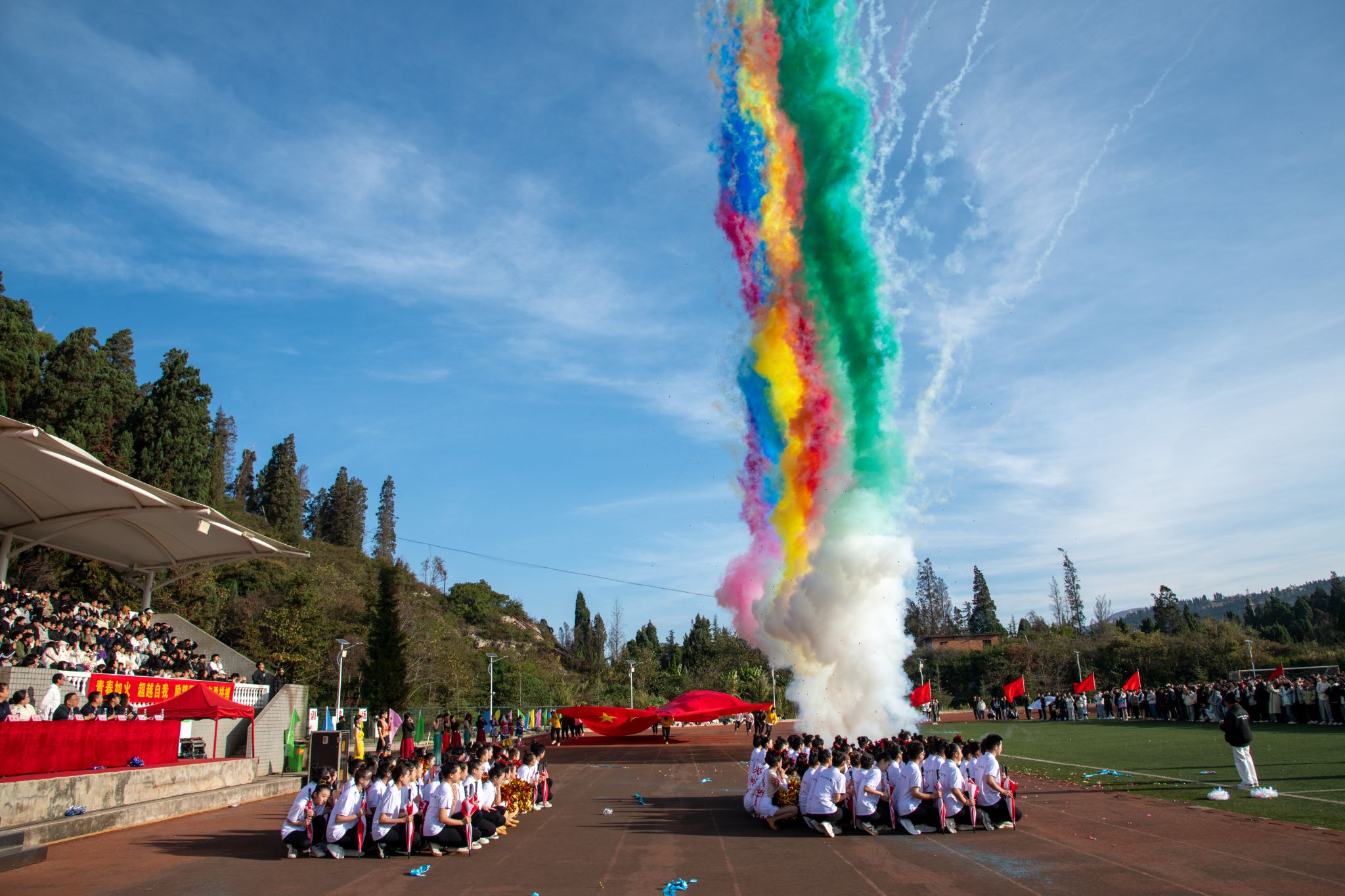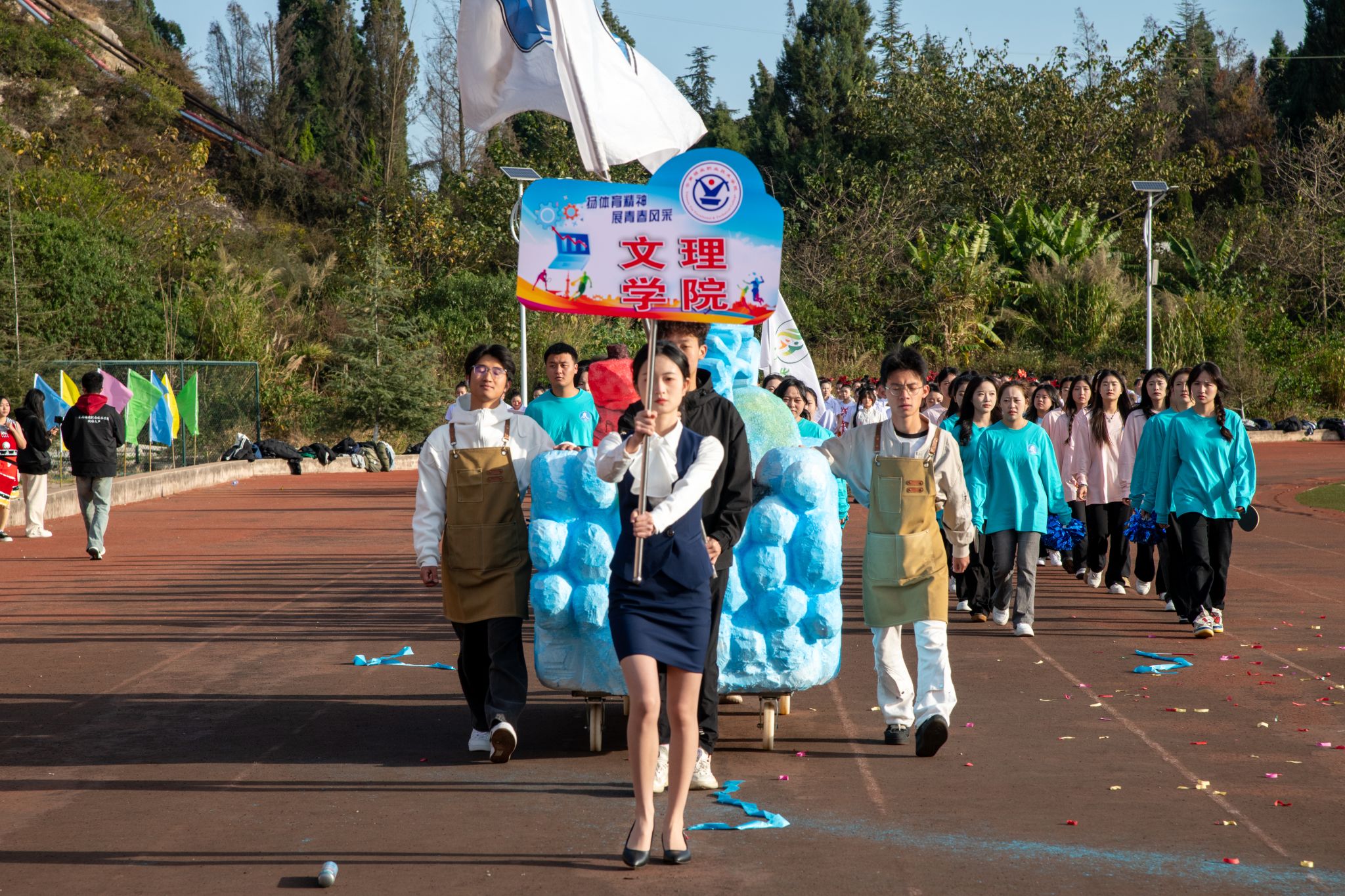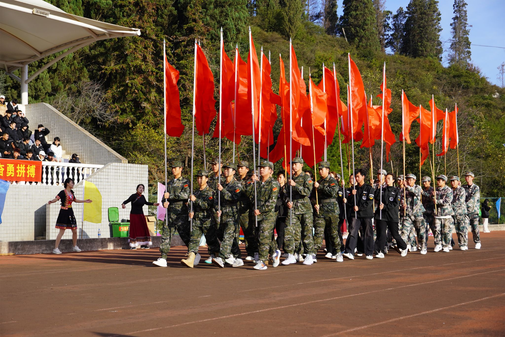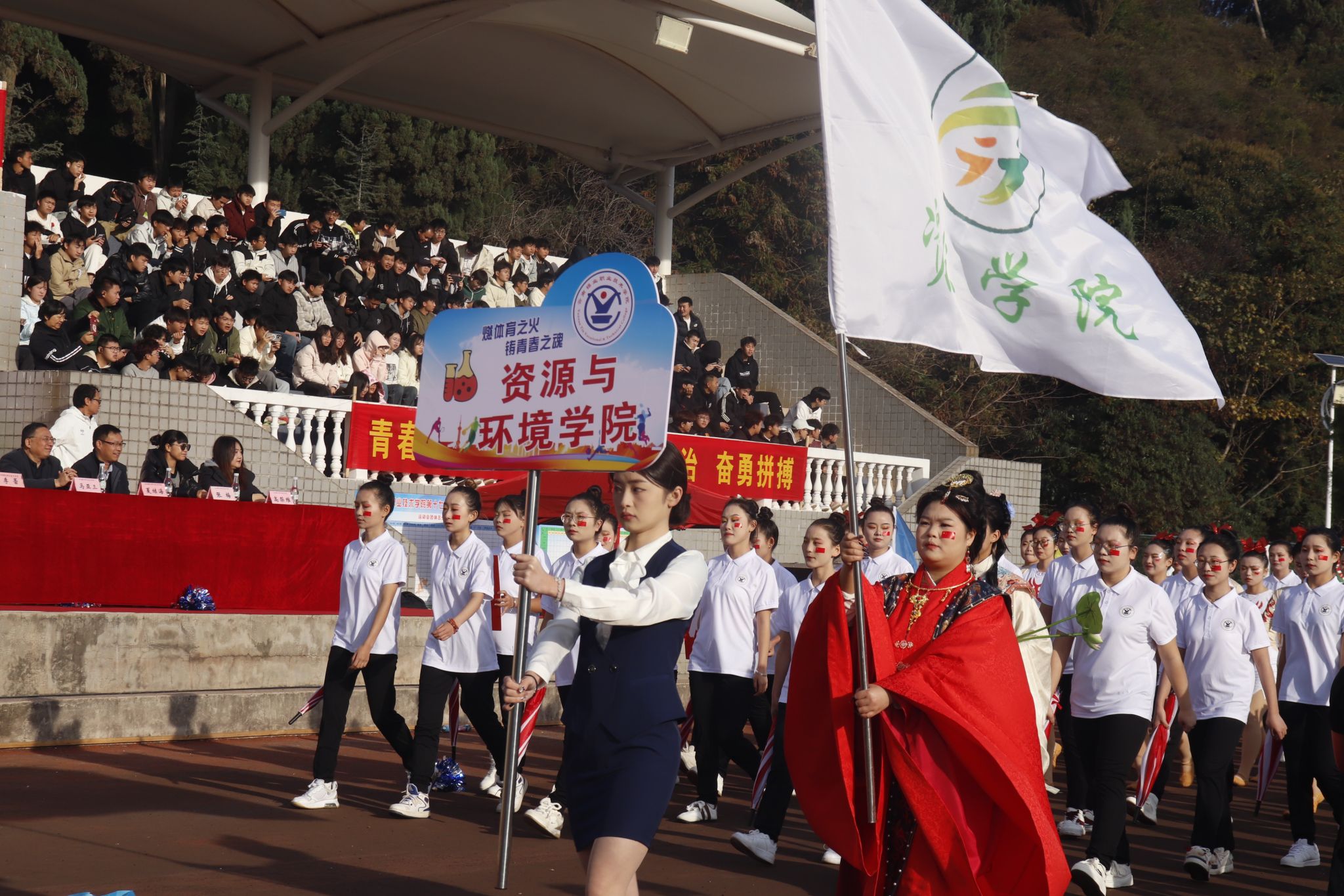 在《运动员进行曲》激昂的旋律中,国旗方队步履铿锵、英姿飒爽,随后,校旗方队、各学院代表方队及裁判员代表队依次入场,他们昂首挺胸,阔步前行,展现出昂扬的精神风貌与坚定的信念决心。