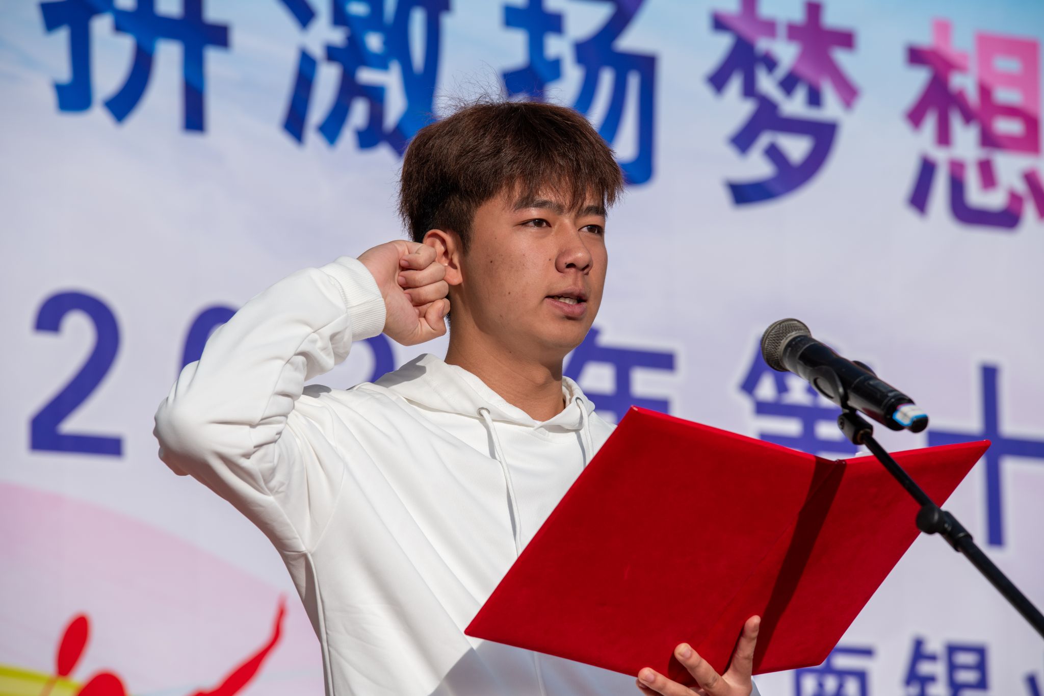 运动员代表朱磊宣誓并表示,将以积极、饱满、热情的态度参加本届运动会,弘扬奥林匹克精神,胜不骄,败不馁,服从裁判,服从指挥,遵守纪律,遵守规则,赛出友谊,赛出成绩。