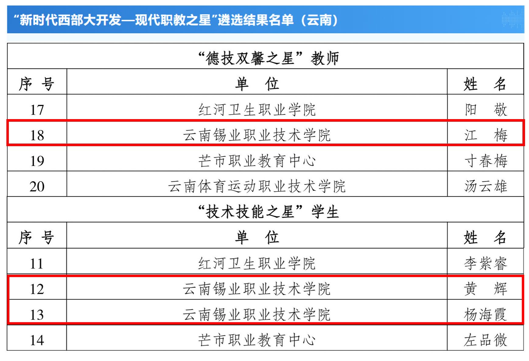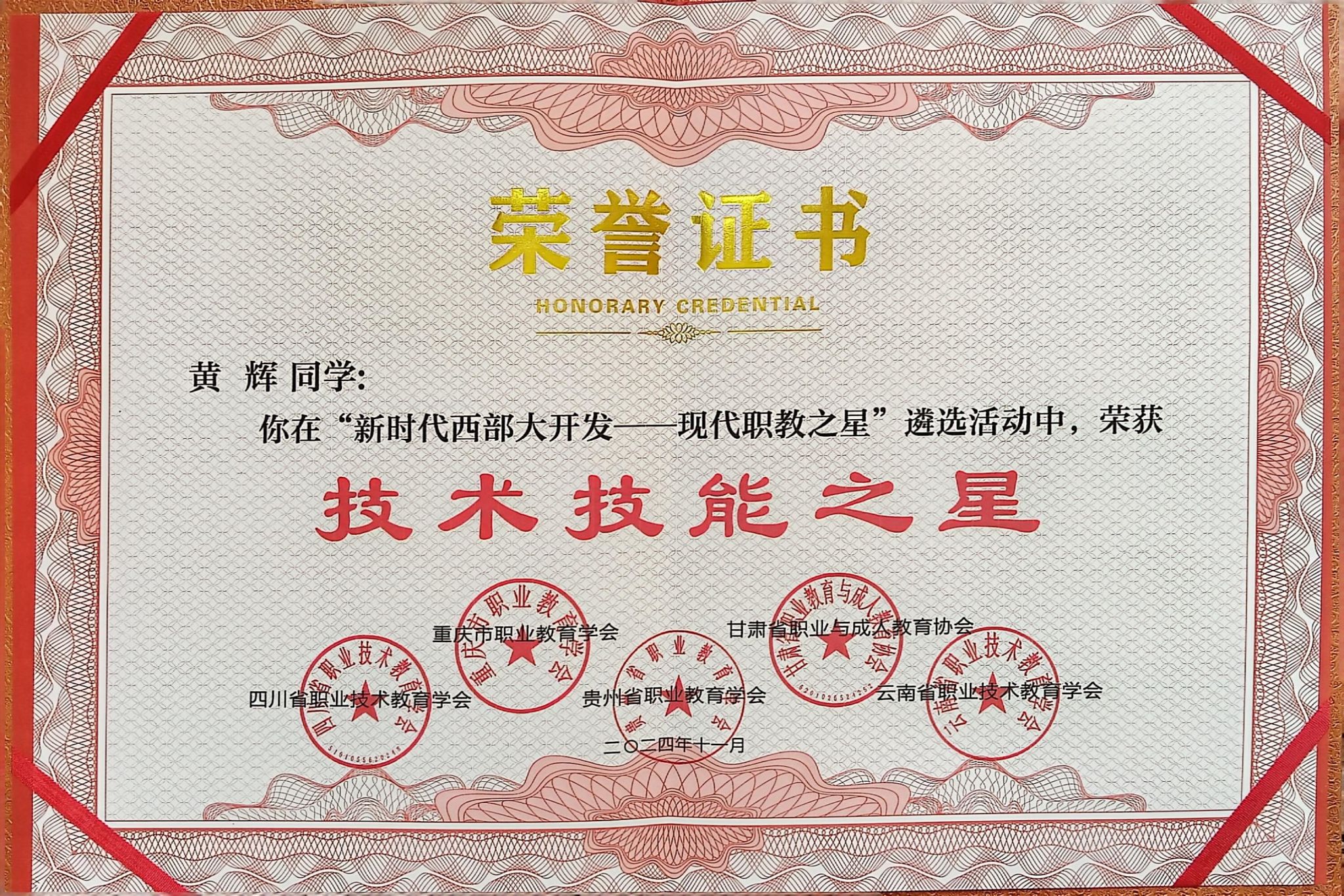 11月7日,由渝、甘、川、贵、云五省市职业技术教育学会联合举办的“新时代西部大开发——现代职教之星”遴选结果公布,学院教师江梅被遴选为“德技双馨之星”,学院青年学子黄辉、杨海霞被遴选为“技术技能之星”。