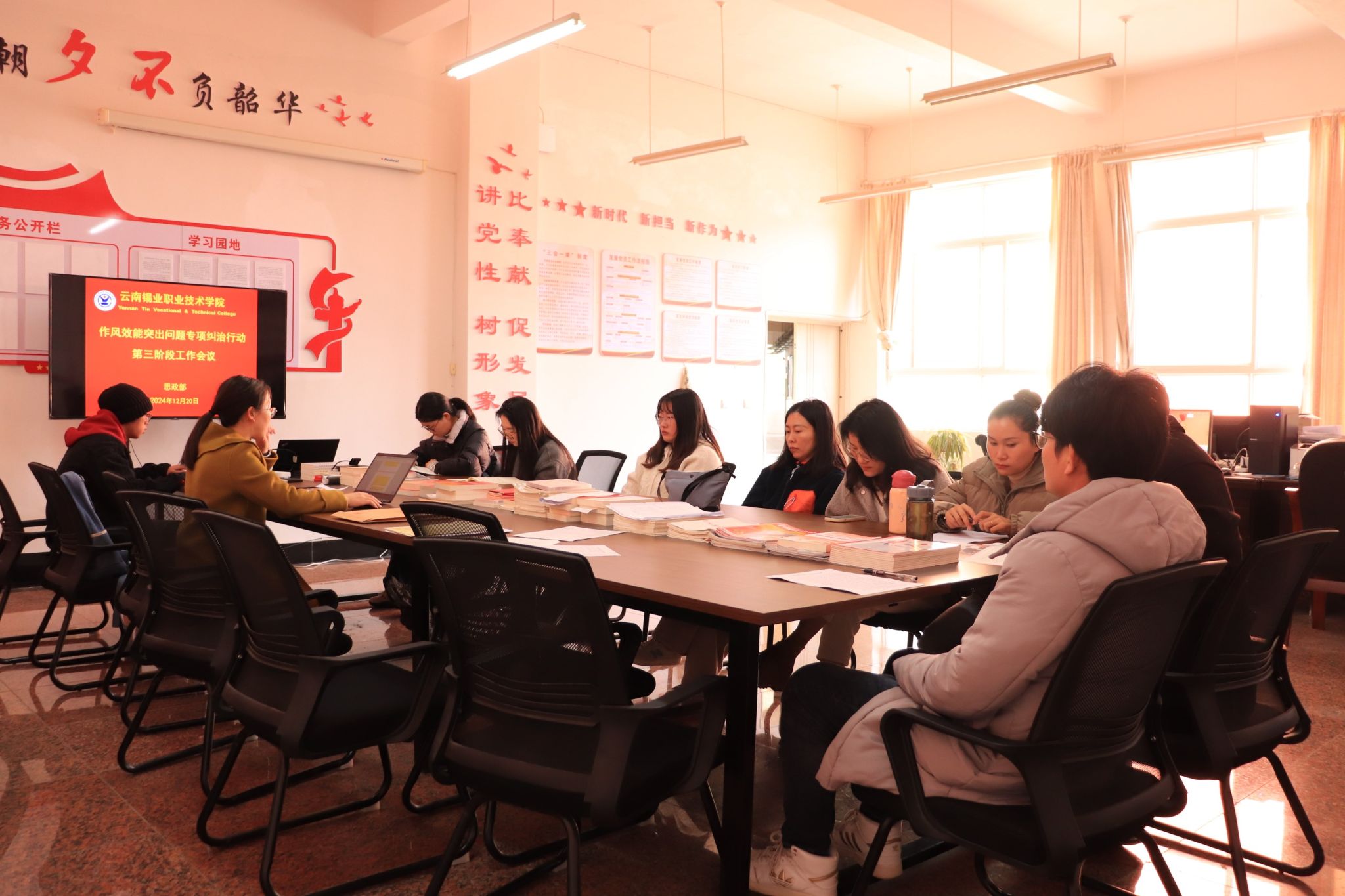 深入学习,筑牢思想根基。深化干部作风建设,要注重教育培训,推动干部提升思想品质与理论素养。学院各部门积极行动,高度重视,认真组织,深入学习习近平总书记关于作风建设的重要论述以及上级部门和学院相关文件、会议精神。部门负责人精心准备专题发言,深入剖析部门在专项纠治行动中的整体情况和存在的问题,部门重要岗位人员也积极准备交流发言,结合自身工作实际分享经验与感悟,确保第三阶段工作能够扎实有效开展。此次集中学习及交流研讨各部门人员现场面对面进行,聚焦部门和个人在专项纠治行动中的不足,深入总结和反思。各部门组织人员认真研读文件,开展专题讨论,分享学习心得,切实将思想和行动统一到学院的要求上来,筑牢了思想根基,明确了方向与重点,纠正了开展作风效能突出问题专项纠治是“走过场、搞形式主义、刮一阵风”的错误认识,深刻认识到作风效能建设的重要性和紧迫性,达到统一部门人员思想,为专项纠治行动的深入开展提供了坚实的思想保障,使全体人员以更加积极的态度投入到工作中。