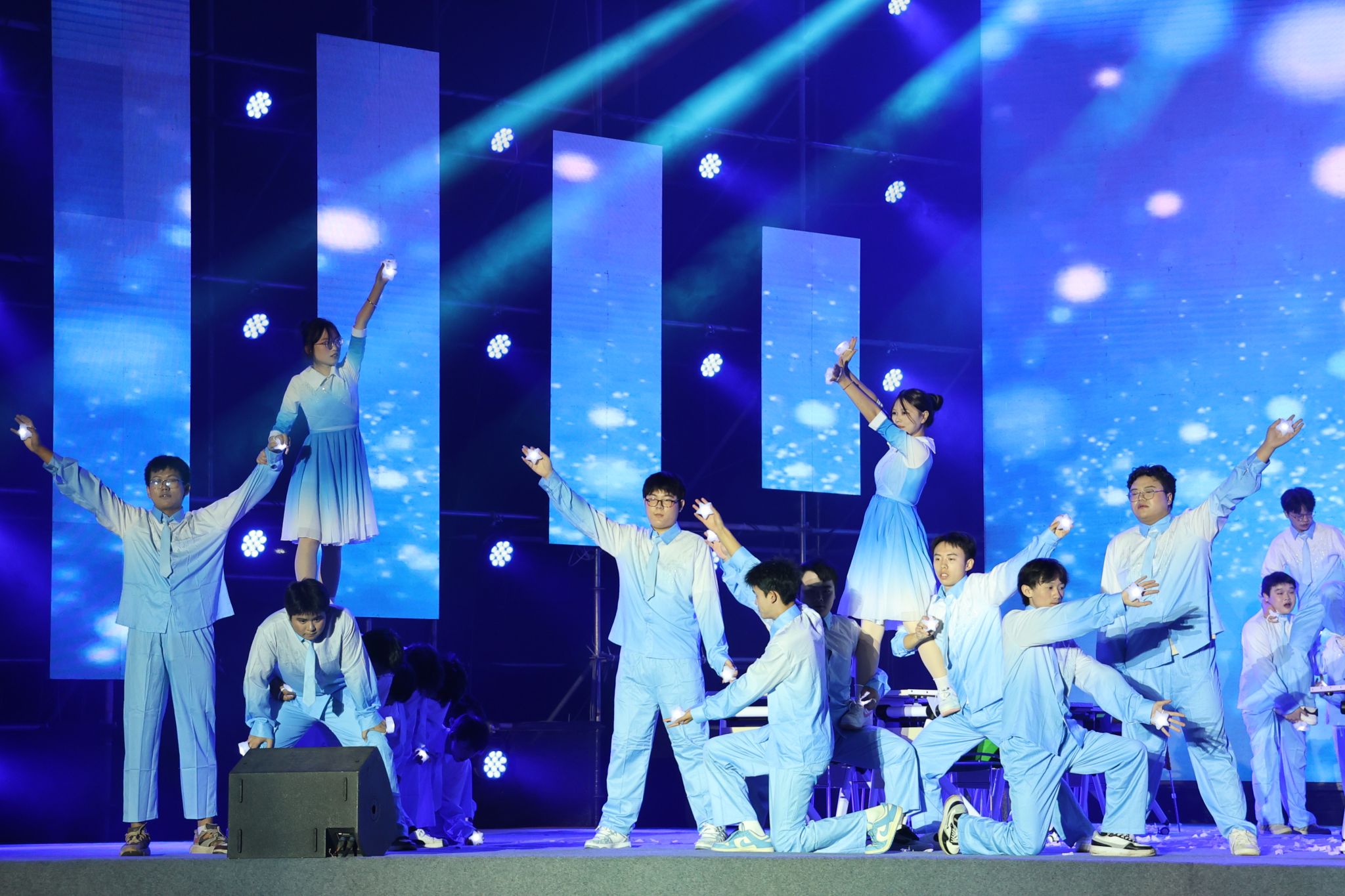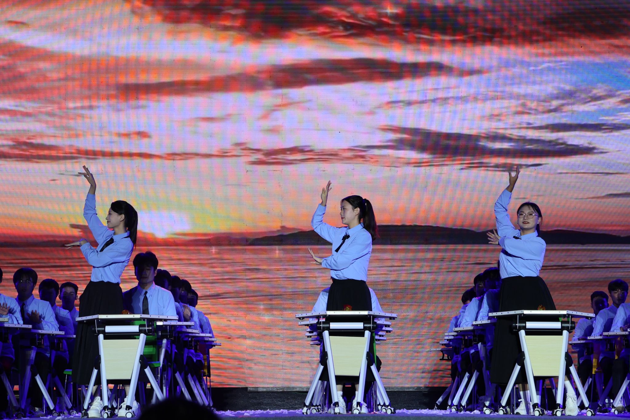 《浪漫樱花》《破茧》《星辰大海》《夜空中最亮的星》等节目,以饱满的情绪、整齐的动作和富有张力的表演,展现出青年学子勇于突破、追逐梦想的青春姿态;《筑梦·东方》《以青春之名,爱我中华》将爱国情怀融入每一次击掌与转身,用肢体语言深情表达对祖国的热爱与赞美;《次仁拉索》《西游记》《欢迎来到八零年代》则巧妙融合民族风情与经典叙事,或带领观众穿越时光,或传递吉祥祝福,尽显课桌舞在文化传承与艺术创新上的多元可能。十二支参赛队伍将力与美、创意与情感完美融合,用整齐划一的动作和昂扬的精神风貌,赢得了阵阵掌声。