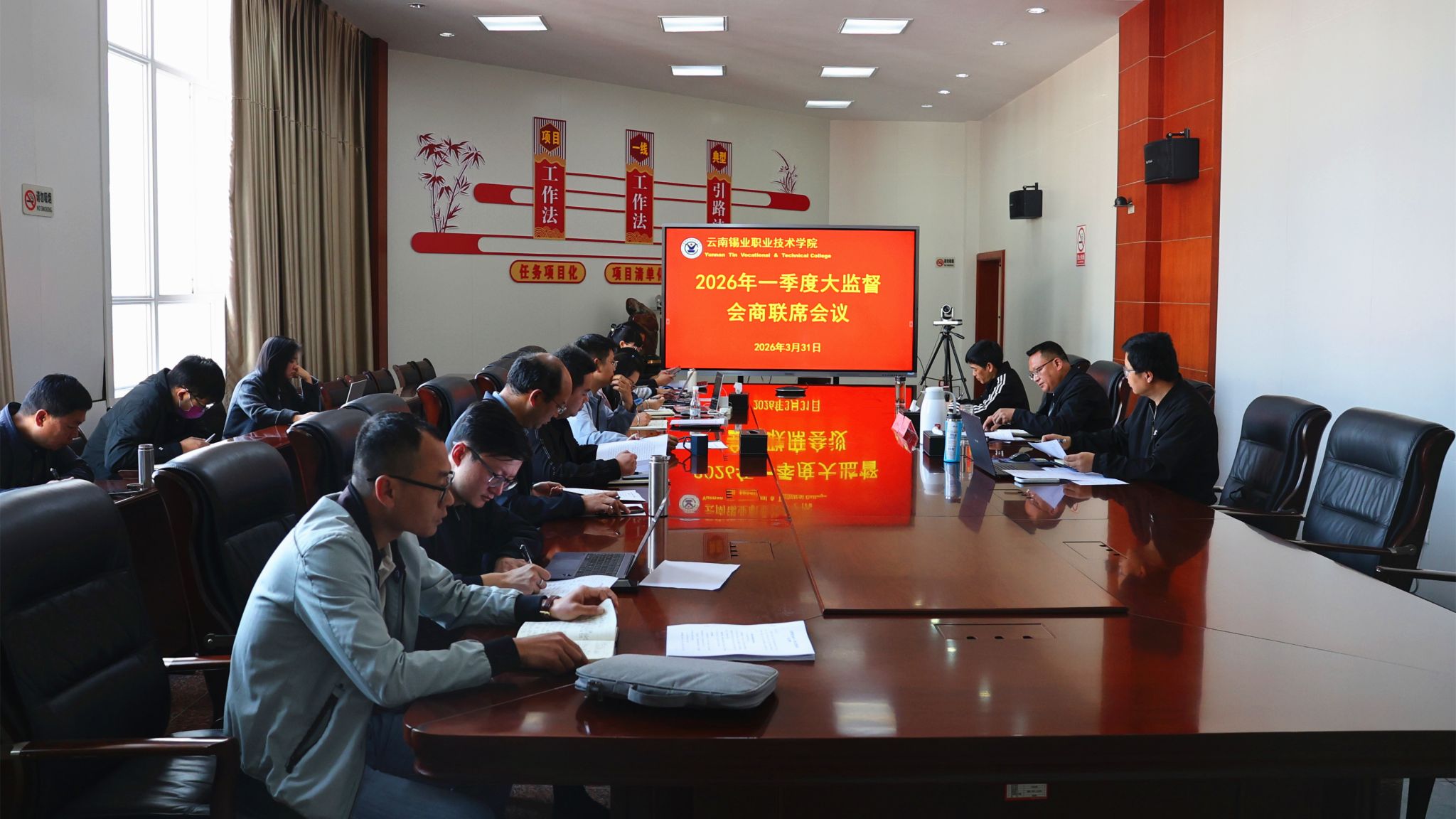 3月31日,学院召开2026年一季度大监督会商联席会议。学院党委委员、纪委书记张云生主持会议并作总结讲话,各部门(中心)、二级学院负责人参加会议。