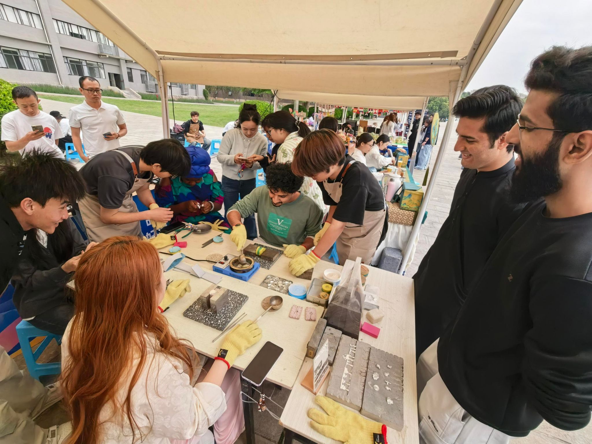 活动现场,学院锡工艺展示体验区成焦点,锡制工艺品琳琅满目,展现师生对传统技艺的创新表达,刻有“云南锡业”标识的纪念摆件,蕴含着深厚的锡文化底蕴,吸引了众多嘉宾的目光。学院师生现场演示锡工艺品制作工序,澜湄国家青年学子观摩并体验锡工艺美术品制作,不少人拿着作品合影留念,为文化体验点赞。