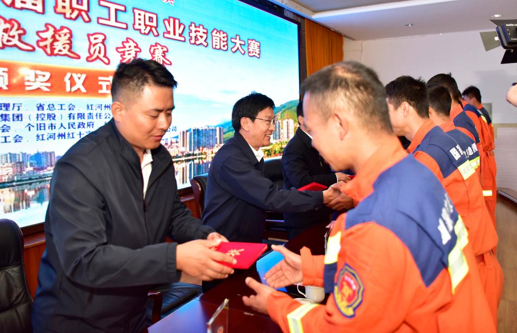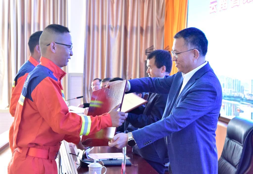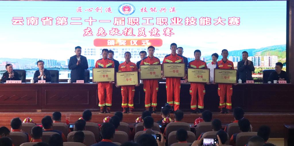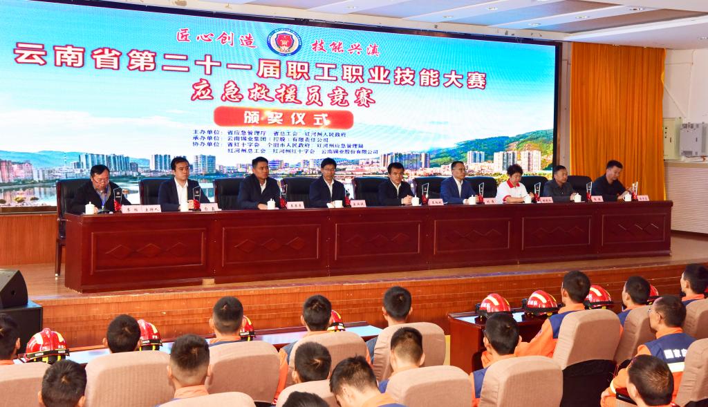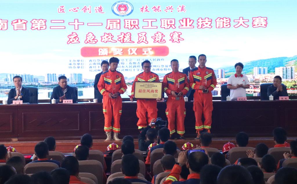 省应急管理厅救援协调和预案管理处处长李柱主持闭幕式并宣布竞赛成绩。云锡应急救援队获团体第六名、矿山冒顶事故处置科目第三名、最佳风尚奖。