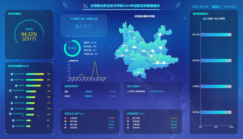 提前谋划,扎实做好迎新筹备。2024年是学院全力打造锡铟全产业链高素质技术技能人才培育平台的起始之年。“在如此重要的时间节点上,学历教育能否持续向好发展,能否成为人才培育平台打造的有力支柱,在2985人招生计划全部投档完成的情况下,怎样做好今年招生的‘后半篇文章’以确保报到率,提前谋划至关重要。”学生工作处负责人说。针对如何做好2024年迎新工作,学院领导高度重视,于今年6月着手筹备迎新工作,先后组织召开4次专题会议研究部署迎新接待、氛围营造、后勤保障、志愿服务等各项工作。学院党委专门召开会议,听取迎新工作筹备情况,主要领导指导迎新现场布置,对迎新报到流程进行全过程预演,确保迎新工作万无一失。在学院全体领导干部、教职工及学生志愿者的共同努力下,迎新工作平稳有序,学院共迎来2500余名新同学,2024年迎新工作已圆满收官。