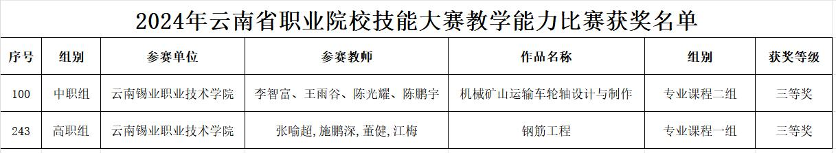 近日,云南省教育厅公布了2024年云南省职业院校技能大赛教学能力比赛获奖名单,学院喜获专业课程一组三等奖1项、专业课程二组三等奖1项。
