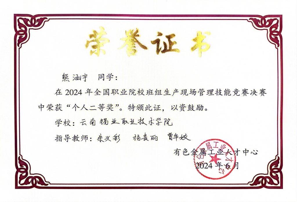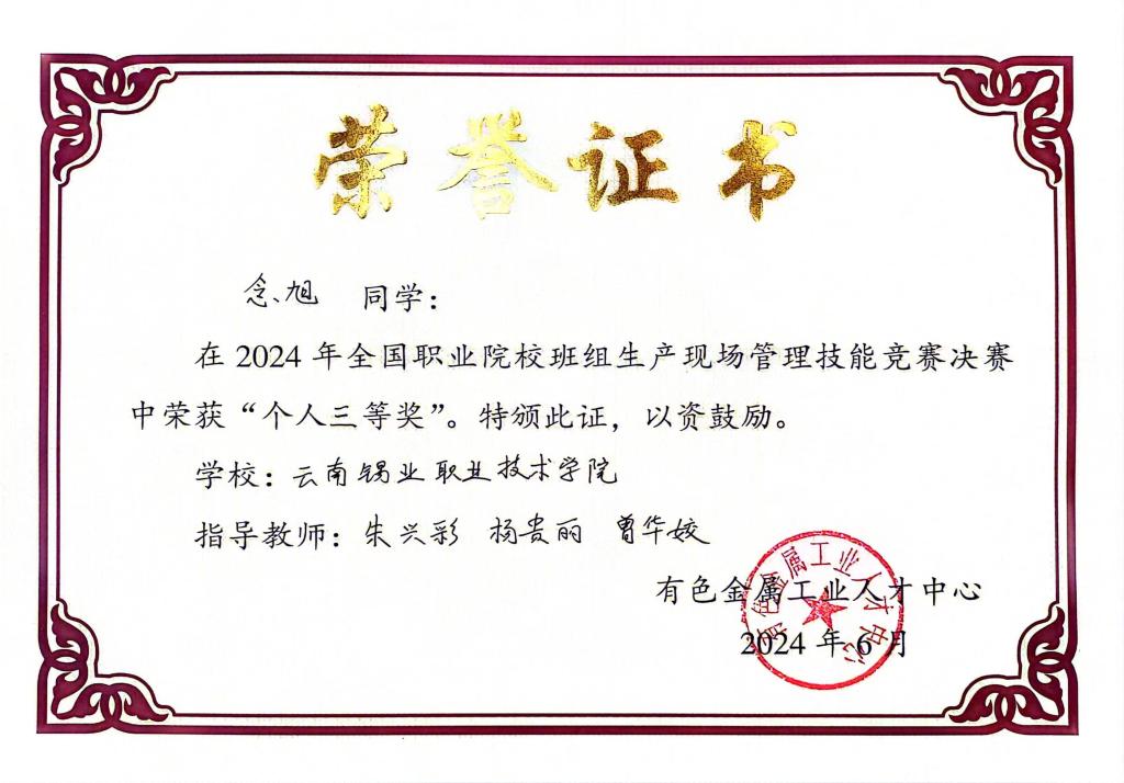 近日,学院在有色金属工业人才中心主办的“2024年全国职业院校班组生产现场管理技能竞赛决赛”中荣获团体三等奖,学生个人荣获二等奖3项、三等奖2项。