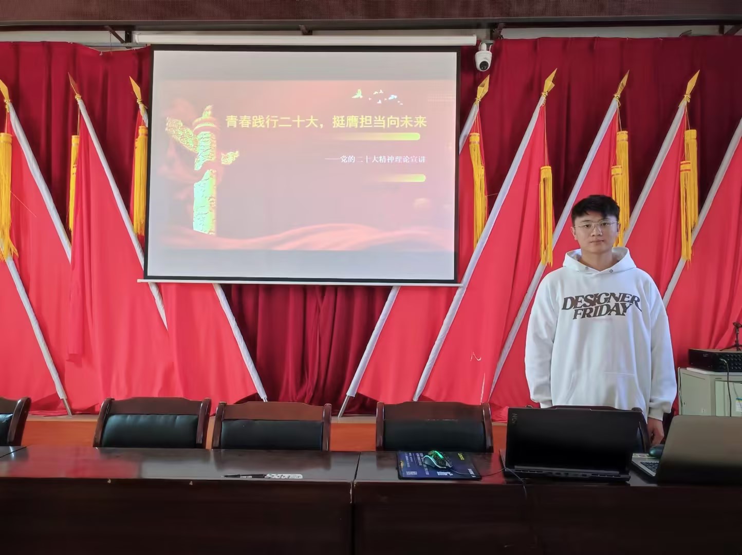 为深入学习党的二十大精神,感悟在中国共产党的领导下当代中国取得的一系列伟大成就,机电工程学院青年学子陈羲在当地村委会围绕党的二十大主题、理论成果等内容开展了一场理论宣讲。宣讲结束后陈羲说:“要讲好党的二十大精神,就必须深入学习习近平新时代中国特色社会主义思想,因为其是当代中国马克思主义、21世纪马克思主义,是中华文化和中国精神的时代精华,实现了马克思主义中国化新的飞跃。”
