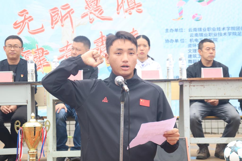 10月15日,学院“无所畏惧肆意青春”第三届“迎新杯”足球赛开幕,学院党委副书记、工会主席张弛,学院党委委员夏继海,团委书记李啉汎以及参赛队员参加开幕式。