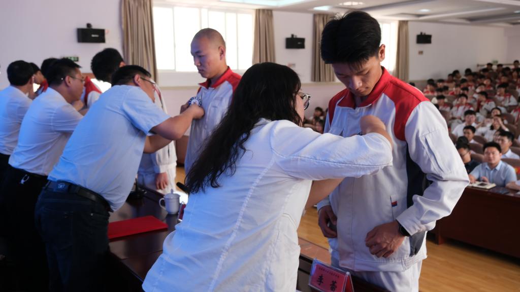 校企双方领导为学生代表佩戴“长城汽车产业学院”徽章,共同为bat365官方网站“长城汽车学院”揭牌。
