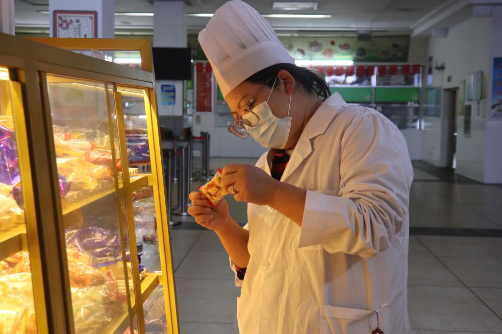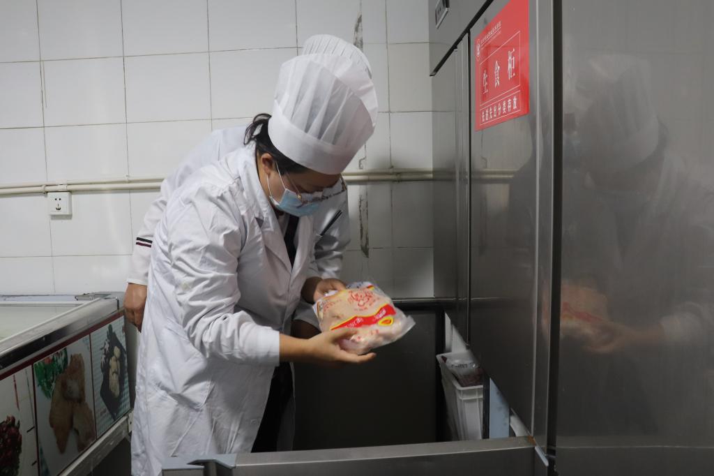 李蕾全面走访调研了学院一食堂、二食堂售卖橱窗、后厨以及所辖格子铺,对校园食堂餐饮具清洗消毒、食品留样、从业人员健康管理、信息公示以及制止餐饮浪费等情况进行了全面检查。