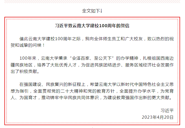 习近平在贺信中指出,100年来,云南大学秉承“会泽百家、至公天下”的办学精神,扎根祖国西南边疆民族地区,培养了大批优秀人才,为促进民族团结进步、服务区域经济社会发展作出了积极贡献。