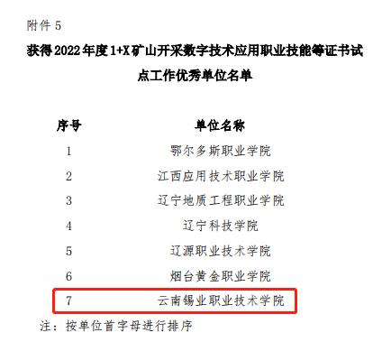 1+X证书制度作为《国家职业教育改革实施方案》的一项重要创新,是进一步落实立德树人根本任务、完善职业教育和培训体系、深化产教融合和校企合作的一项重要举措。学院按照《云南省教育厅关于做好第三批1+X证书制度试点工作的通知》要求,认真研究证书内涵、职业技能等级标准及培训评价组织发布的有关材料,客观评估现有资源,于2020年9月成功申报成为全国首批矿山开采数字技术应用职业技能等级证书试点院校。2020年12月至今,学院组织了3批次学生参加了该证书的培训考核,通过率在各院校中名列前茅。2022年,学院在组织学生完成证书培训考核的基础上,受培训评价组织机构邀请编制了1400道理论考核试题,开展了其他院校2个批次的学生实操考核阅卷。