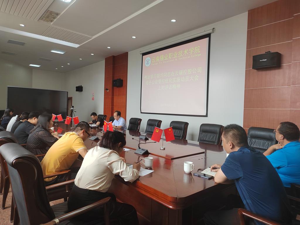 6月21日,学院在教学楼五楼中会议室专题传达学习胡均同志在云锡控股公司母子公司管控优化实施动员大会上的讲话精神,学院党委书记张鹏主持会议,党委委员夏继海、各部门负责人参加会议。