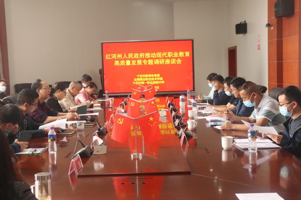 张鹏详细汇报了学院改革发展的基本情况以及职业教育取得的成效及经验做法,分析了现代职业教育高质量发展存在的问题及原因,并从“整合职教资源,打造红河职教品牌”、“组建职教集团,实现职教集群发展”、“深化校企合作,助推地方经济发展”三个方面提出了意见和建议。