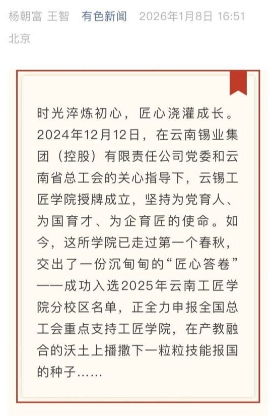来源:新华财经、云南日报-云新闻、云岭职工、云南政协报、中国有色金属报、有色新闻、锡都个旧