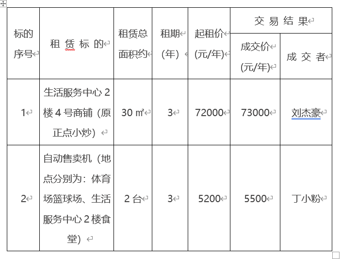 一、租赁标的交易结果: