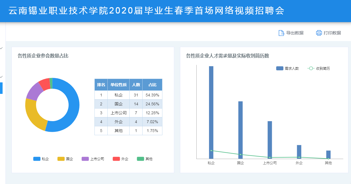 此次网络视频招聘会吸引了来自全国多个省(市)的近70家用人单位报名,优选出57家单位参加,涵盖了教育、制造、金融和技术服务业等10个行业领域,共提供就业岗位229个,招聘需求人数达3830人,有力地保障疫情防控期间毕业生就业工作的平稳有序进行。