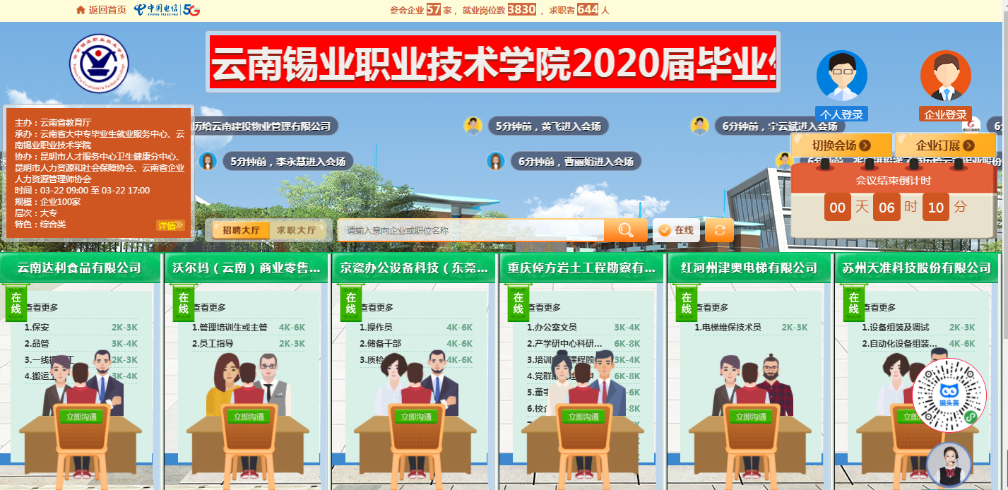 3月22日,学院通云南省教育厅搭建的网络招聘平台举办了“bat365官方网站2020届毕业生春季首场网络视频招聘会”,此次招聘会由云南省教育厅主办,bat365官方网站、云南省大中专毕业生就业服务中心承办。