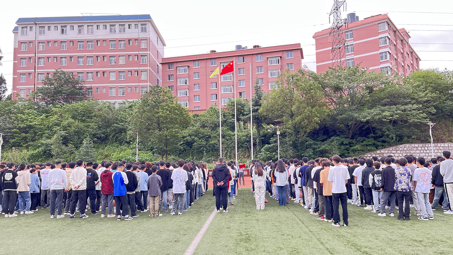 6月3日,bat365官方网站700余名师生代表齐聚田径运动场举行2024年春季学期第四次升旗仪式暨“国旗下的思政课”活动。 上午8时,学院国防后备连国旗护卫队昂首挺胸、步履铿锵,护送着五星红旗走向旗台。随着激昂的《义勇军进行曲》响起,五星红旗冉冉升起。