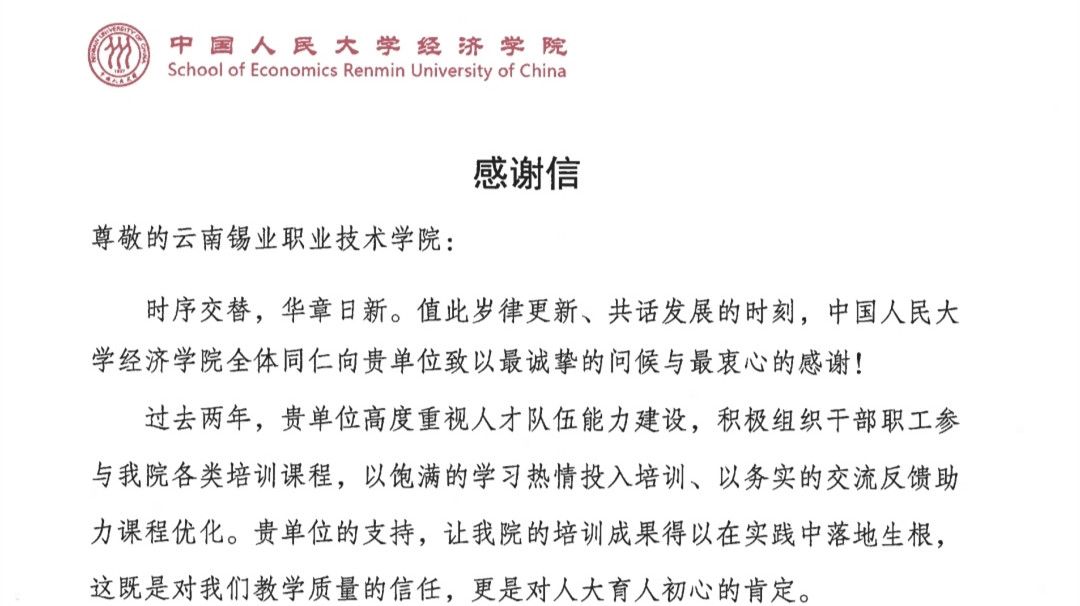 2月2日,学院收到了中国人民大学经济学院发来的感谢信,信中对学院过去两年积极组织干部职工参与其培训课程、助力课程优化的大力支持表示诚挚感谢,并对未来深化合作、协同发展提出了热切期盼。感谢信指出,学院高度重视人才队伍能力建设,组织干部职工以饱满的学习热情投入培训,以务实的交流反馈助力课程优化,让培训成果在实践中落地生根,这既是对中国人民大学经济学院教学质量的信任,更是对中国人民大学育人初心的肯定。一直以来,...
