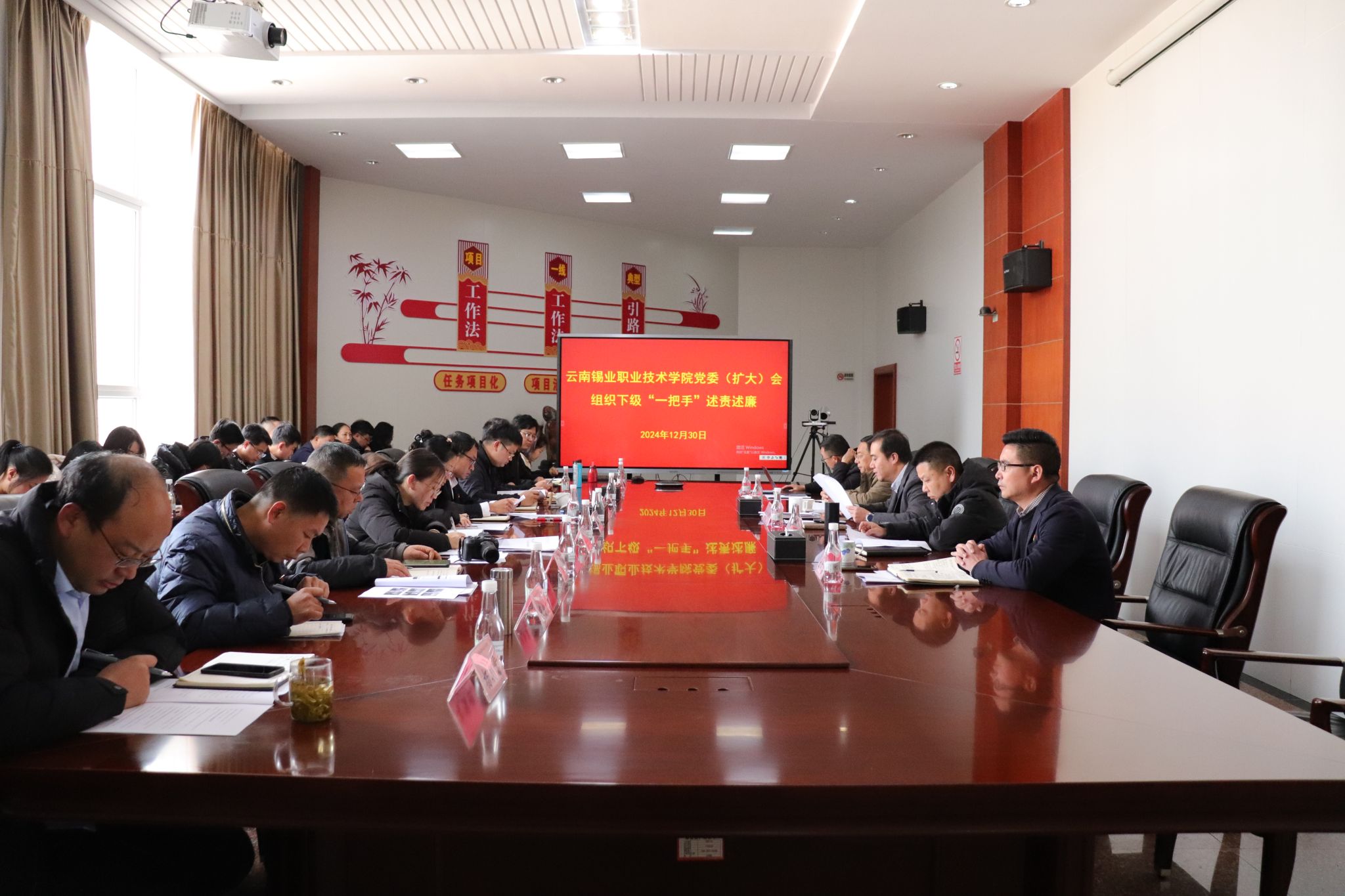 12月30日下午,为深入贯彻落实全面从严治党的战略方针,坚定不移推进学院党风廉政建设和反腐败工作,切实推动全面从严治党向基层延伸,学院在中会议室组织召开党委(扩大)会听取下级“一把手”述责述廉。学院党委书记俞鑫主持会议对学院各党支部书记现场述责述廉情况进行点评,并作总结讲话。俞鑫指出,“一把手”述责述廉能切实增强党员干部的纪律规矩意识、廉洁自律意识,能激发担当作为、干事创业的内生动力,是落实全面从严治党要求的重要举措。...