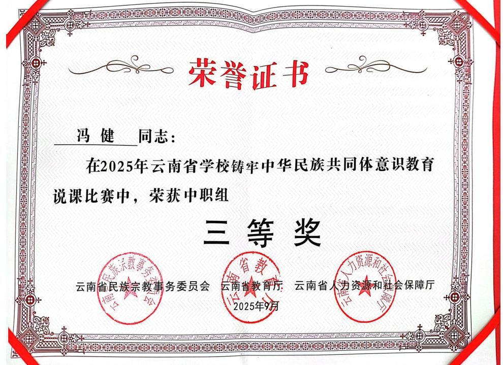 近日,由省民族宗教事务委员会、省教育厅、省人力资源和社会保障厅联合主办的2025年云南省学校铸牢中华民族共同体意识教育说课比赛圆满落幕。学院教师冯健凭借扎实的教学功底和创新的教学设计,从全省202名参赛教师中脱颖而出,荣获三等奖。