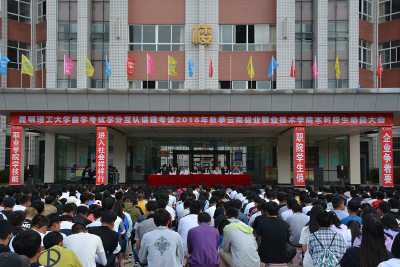 9月12日下午,职业学院举行昆明理工大学高等教育自学考试学分互认课程考试2018年秋季本科段的招生动员大会。学院副院长赵云鹏、曲向哲、昆明理工大成人教育学院院长樊刚、综合办主任叶春林、学技科科长孙冠华、自考办教师周志梅以及学院相关负责人等1300余名师生参加了动员会。会上,昆明理工大学成教学院院长樊刚介绍了昆工成教学院及学分互认的基本情况并对职业学院长期以来对昆工成教工作的大力支持表示感谢。昆工成教学院...